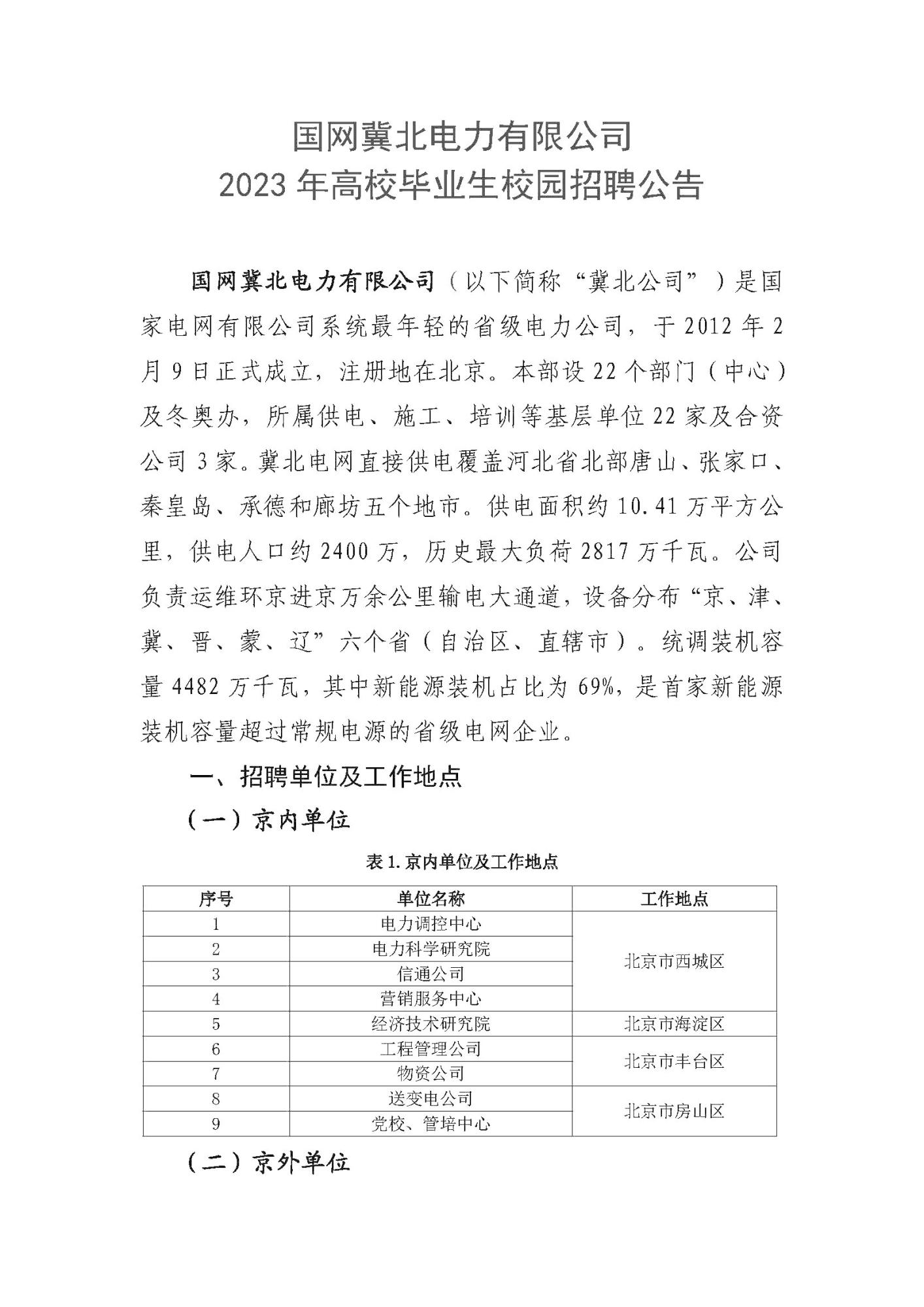 国网冀北电力有限公司2023年高校毕业生校园招聘公告