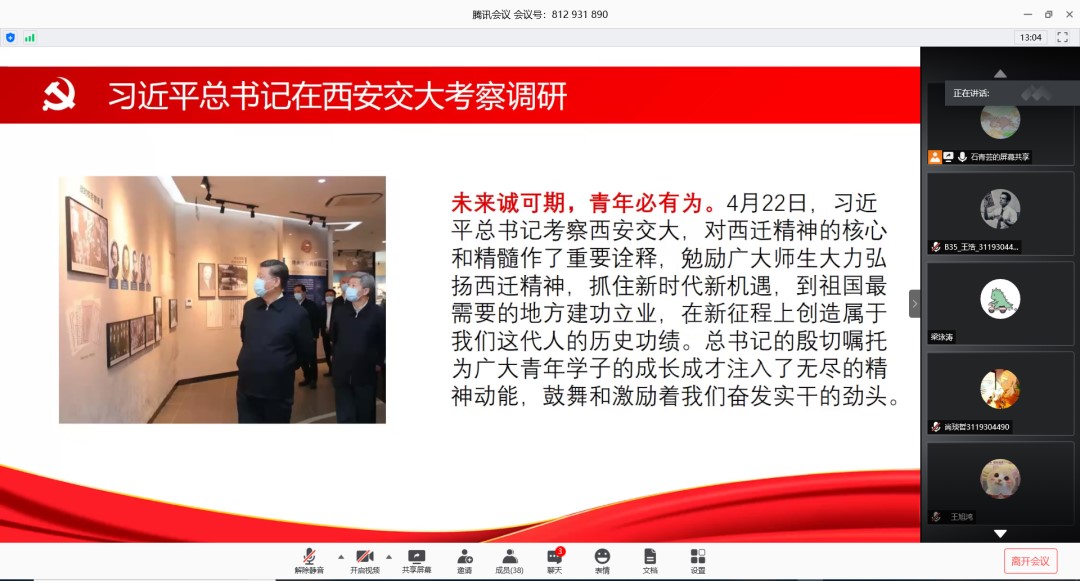王璇同学表示作为一名西交的研究生党员,还要做西迁精神的新传人,秉持爱国主义精神,坚定不移听党指挥跟党走,脚踏实地地汲取知识。最后,作为朝气蓬勃的新时代青年,我们更要积极主动将自己的青春梦与中国梦相结合,为中华民族伟大复兴努力奋斗。