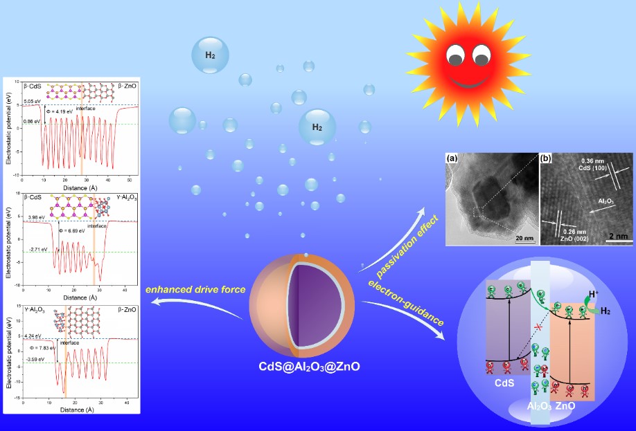 电力设备电气绝缘国家重点实验室新型储能与能量转换纳米材料研究中心,在CdS@ZnO核壳异质结催化剂(Nano Energy39 (2017) 183−191)的前期工作基础上,通过原子层沉积在CdS和ZnO之间引入具有良好表面相容性的超薄Al2O3钝化层,得到CdS@Al2O3@ZnO核壳异质结催化剂,其光催化产氢性能从CdS@ZnO的70.47 mmol/g/h提高到101.3 mmol/g/h。实验和理论计算结果表明,超薄Al2O3层不仅有效钝化了CdS与ZnO之间的界面缺陷,而且将CdS与ZnO之间的载流子传输机制从直接Z型转变为类似II型,产氢反应位点从CdS@ZnO催化剂的CdS核表面转移到CdS@Al2O3@ZnO催化剂的壳表面,从而显著提升光催化产氢性能。该项工作表明可以通过异质结界面调控促使载流子迁移机制向有利于光催化反应的方向,为提高异质结催化剂的光催化产氢性能提供了一条新的路径。