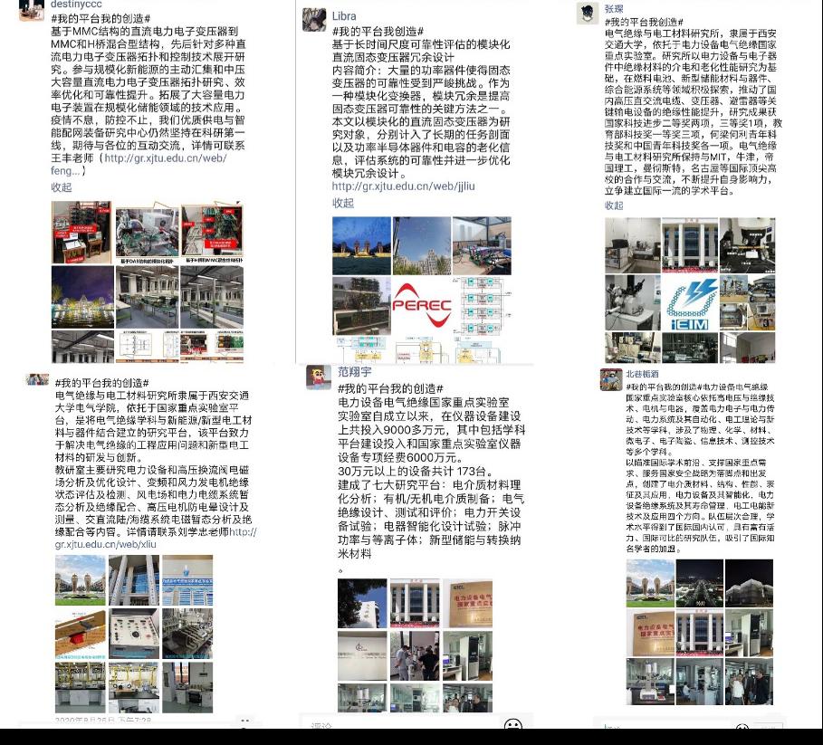 8月25日起,广大电气学子掀起了 “我的平台我的创造”宣传热潮,纷纷在微信、微博等平台以图文的方式推介各自所在的研究团队与研究成果,充分发挥主人翁精神,对外展现了学院众多先进的科研平台、强大团队力量与优秀的原创成果,用实际行动为即将到来的“科创月”活动预热。