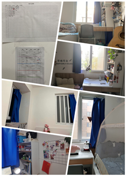 创新港的五室一厅,给每个人独处的时光与共享的空间,五个姑娘过着独立又融洽的“老友记”生活。1号房的处女座姑娘睢锐房间最为整洁干净,书架上的绿萝也时常乖顺地垂下;狭长的2号房住着西安土著张琛,吉他、瑜伽垫、衣架、打气筒也整齐立正;朝阳的那面3号房里,常晓雪坐拥飘窗,一览众小,电子琴、吉他彰显艺术之灵魂;4号房的庞曦作为唯一的南方姑娘,痴迷重庆火锅,性格直爽可爱,时常心有猛虎、勇攀高峰,在宿舍健身狂潮的影响下坚定迈向更健康更阳光;5号房时常传出嘻哈、相声、舞曲的快乐,这都来自兴趣广泛、热情活泼的张露阳,一面照片墙记录着女孩细腻的回忆与感动。客厅一张圆桌承载了五个女孩的八卦、游戏、心事、讨论、分享,值日表、落地镜、鞋架、装饰画以及圆桌上新开的花,每个人每一天每一点,小溪流渐渐汇入美丽的010301江海。