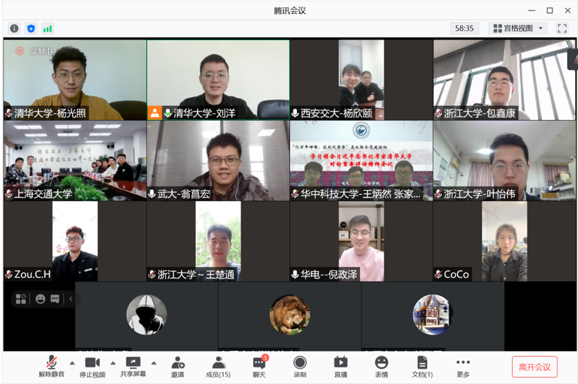 代表,与清华大学、上海交通大学、浙江大学等八所高校的电气院系学子代表齐聚线上,学习习近平总书记考察清华大学时的重要讲话精神,共同领会习近平总书记对青年学子的殷切希望。结合西迁精神和创新港“6352”工程,杨欣颐和郭泓霖分享了自己对于党的百年历史以及目前新时代新青年所肩负的历史使命的认识与理解,带动各高校学子从百年党史中汲取前行力量,在电气领域里堪当时代大任,力求以创新合作的发展思路、优异杰出的科研成果献礼建党百年。