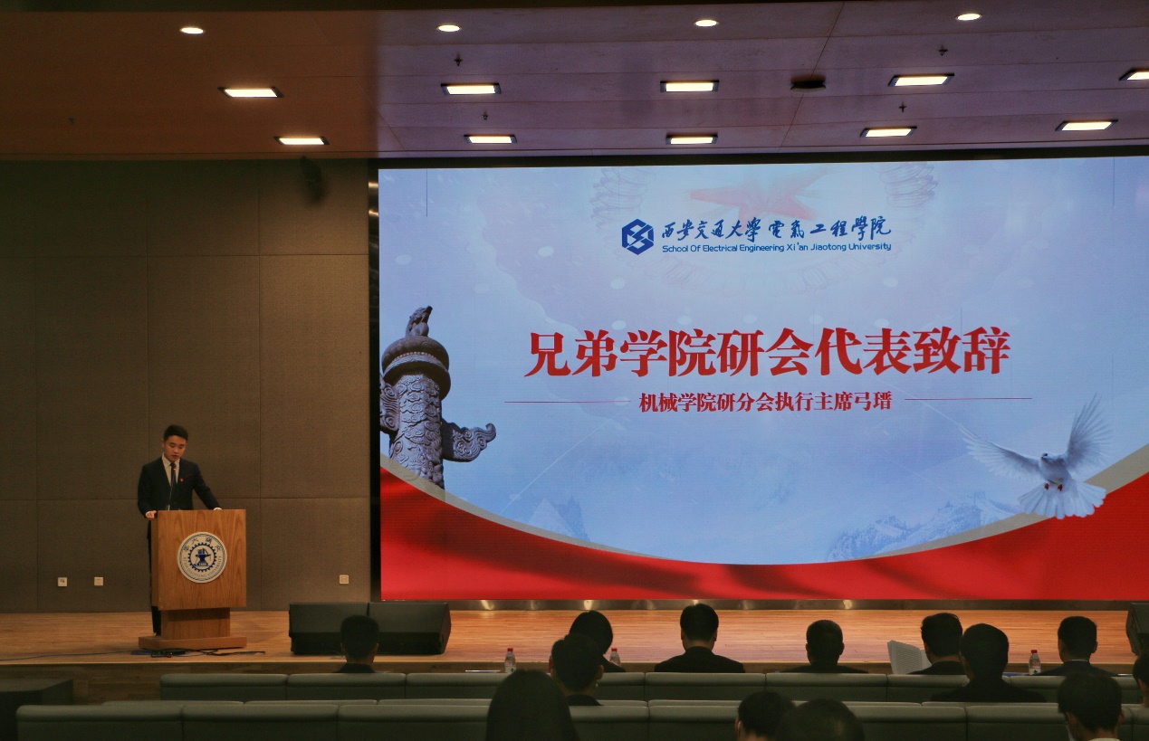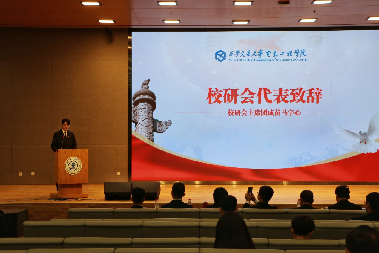 校研究生会代表马宇心对大会的召开表示祝贺,对电气研分会工作成绩表示充分认可,希冀广大电气学子能够戮力同心,为实现中华民族伟大复兴的中国梦贡献交大电气青年的青春力量。