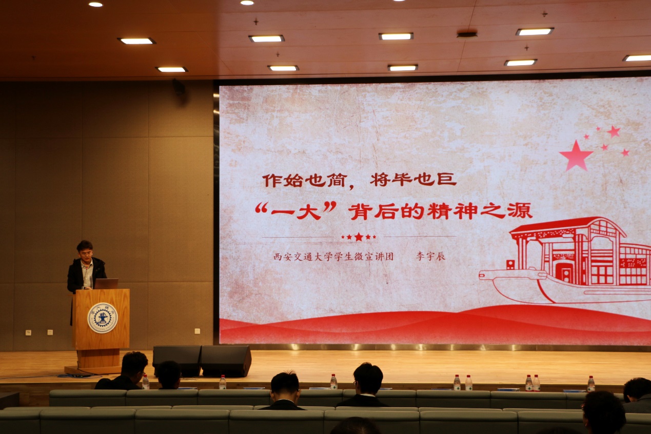 校微宣讲团李宇辰就中国共产党伟大建党精神做主题宣讲,研究生会主席团候选人陈锦坤宣读了倡议书。