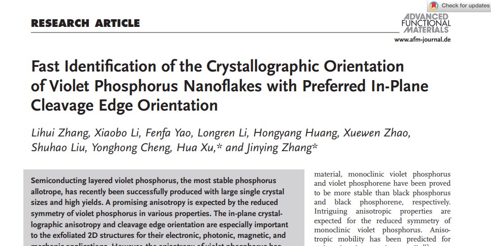 二维材料结构上的各向异性使如压电效应、载流子迁移率、振动模式、光学性质、力学性质和应变诱导的带结构调制等的物化特性具有高度各向异性。而如何快速无损简易地判断二维材料的晶向方向是探索其各向异性的关键,也是一大挑战。本课题组于2019年首次合成宏观紫磷单晶并确定其晶体结构的基础上,发现紫磷是至今为止最稳定的磷的同素异形体。作为一种低对称性的二维材料,紫磷烯具有的各向异性尚未被探索,如何快速确定二维紫磷纳米片的晶格方向是探索其应用前景的基础和挑战。