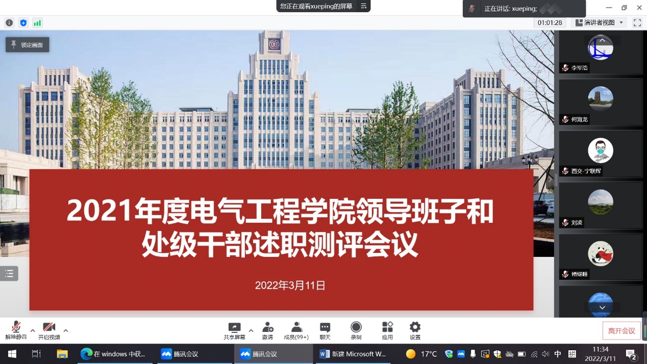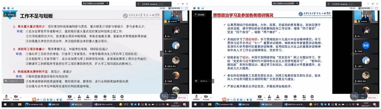学院党政班子成员逐一进行了述职述廉及民主测评,就2021年度各自分管工作做了详细的报告和总结,查漏补缺,审视不足。