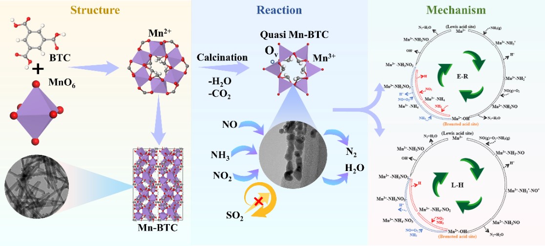 、电力设备电气绝缘国家重点实验室新型储能与能量转换纳米材料研究中心,研制了一种新型脱硝催化剂quasi-Mn-BTC。该催化剂是介于金属有机框架和金属氧化物之间的一种过渡态,具有丰富的氧空位、独特的分级多孔结构和半金属特性,抗硫性能优异。该催化剂活性位点和二氧化硫之间电子传输不易发生,因此二氧化硫难以在活性位点上发生吸附和反应;同时,独特的分级多孔结构使催化材料选择性吸附氨和氮氧化物,不吸附二氧化硫,从而避免二氧化硫与氨和氮氧化物之间的竞争吸附,提升了催化剂的抗硫性。该研究突破了锰基低温脱硝催化剂抗硫性差这一瓶颈,揭示了其抗硫性能优异的内在原因,为提高锰基催化剂抗硫性能提供了新的思路。