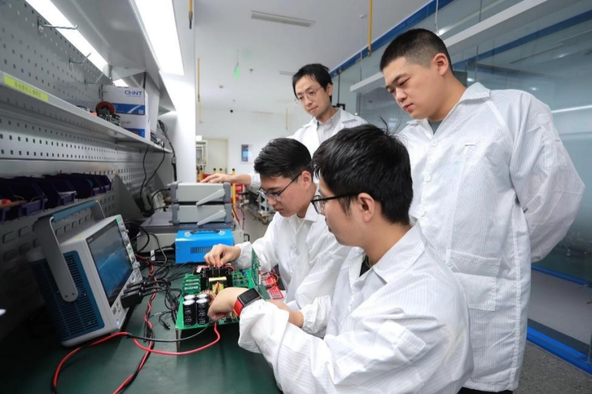 王跃教授、刘佳副教授和正泰集团工程师曹学谦、余凯锋正带领学生紧张忙碌地开展多项合作实验。作为双方合作项目之一的高效率微型逆变器拓扑及控制方案研究,校企双方合作建立了600W实验样机,对稳态、动态、软开关、效率等特性进行系列测试,以验证项目方案的有效性。