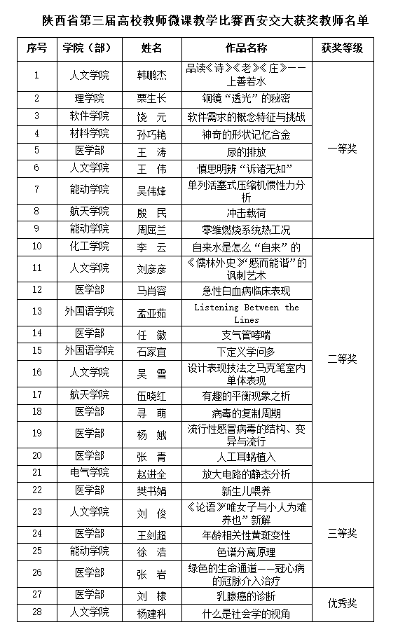 近日,陕西省第三届高校教师微课教学比赛结果揭晓,全校共有28件作品获奖,获奖总数位居全省第一。在全部本科类26件一等奖获奖作品中,西安交大共有9件入选,位居全省第一。这是学校参加此项赛事以来的最好成绩,学校同时获得优秀组织奖。