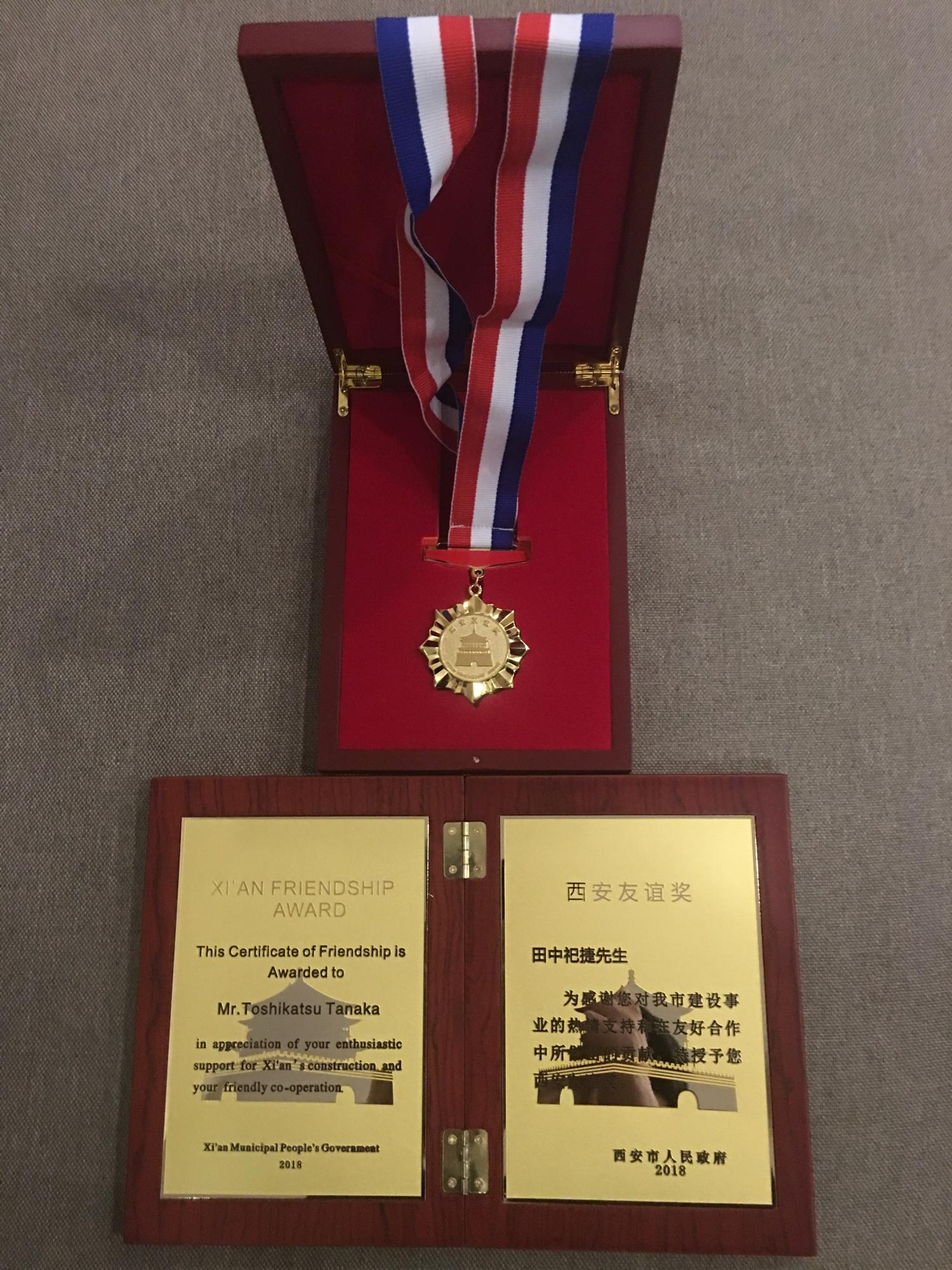 田中祀捷教授获得的2018年“西安友谊奖”奖章及证书