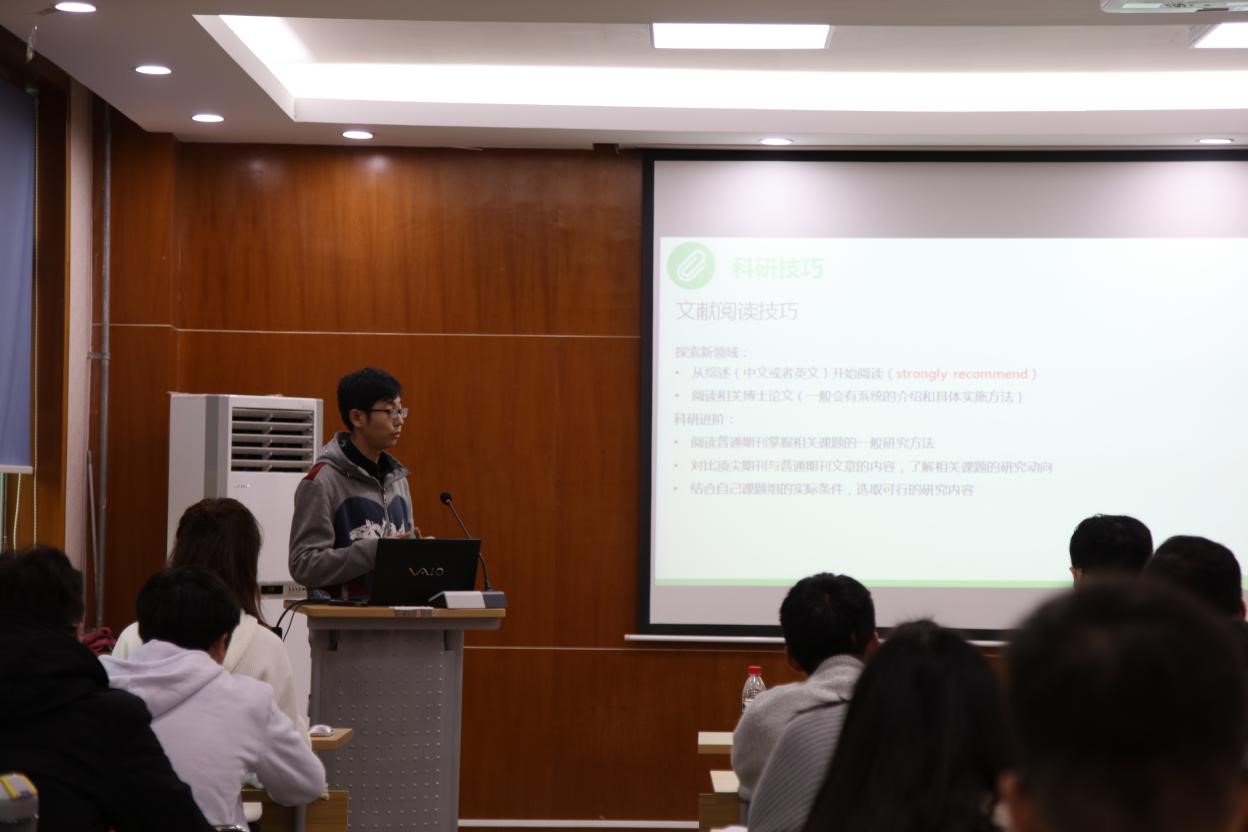 接着,国奖获得者徐广钊同学从科研、竞赛、学生工作入手,讲述了他的心得体会。徐广钊同学曾获得全国大学生英语竞赛研究生组二等奖,在托福考试中更是取得了106分的好成绩,在提高英语水平方面,他也有着独到的方法。他建议同学们可以多读英文文献,合理使用有道等软件,也可以把自己的手机、电脑改成英文版,提高自己的词汇量。在搞好科研工作的同时,徐广钊同学也建议同学们多了解企业、国家的发展动态,熟知科技前沿方向。