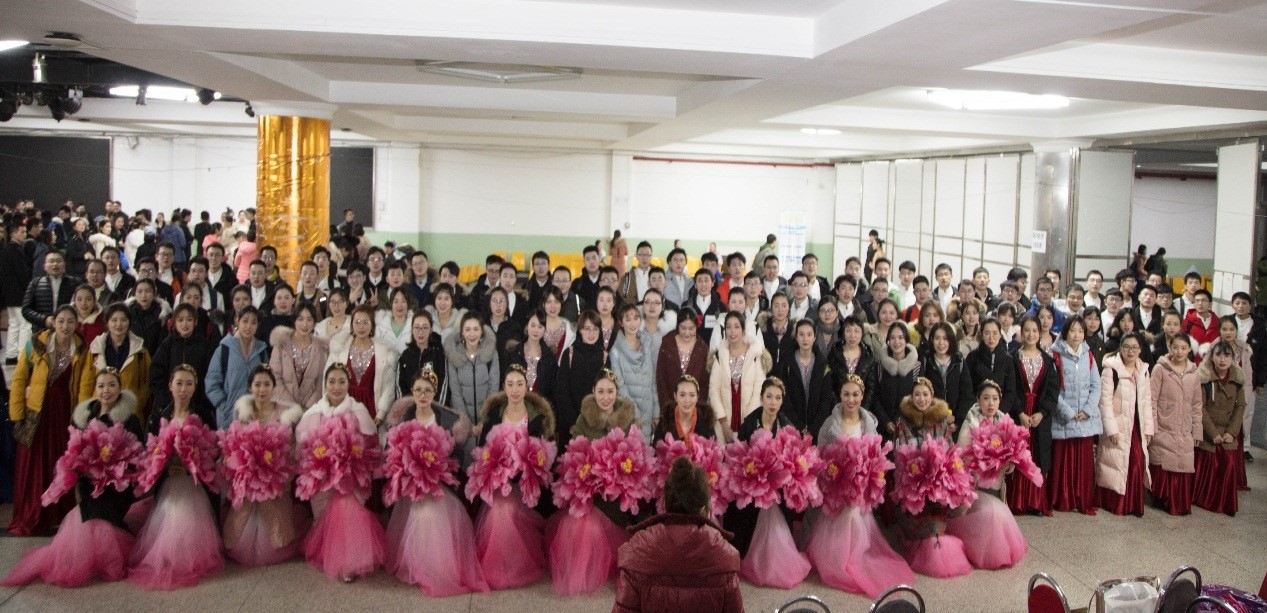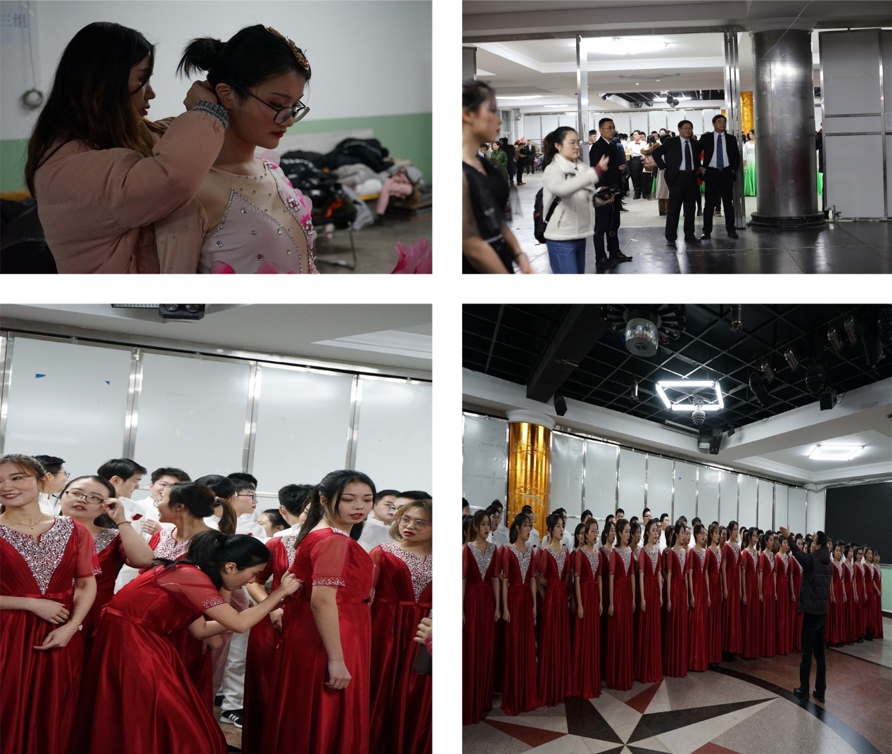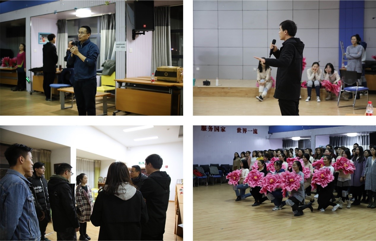 2018年11月26日,舞蹈组与合唱组第一次一起合练,学院副书记宋杰老师和学院辅导员罗文成老师来到东九13楼为同学们加油打气。