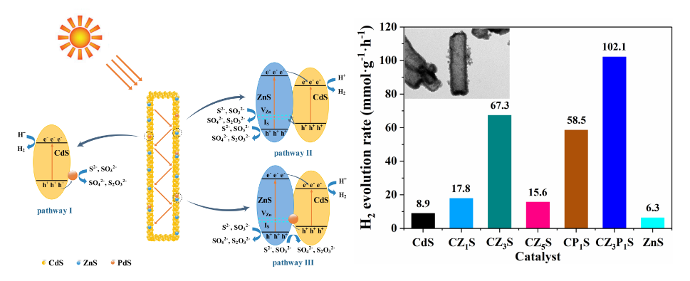 新型储能与能量转换纳米材料研究中心,通过一步硫化Cd(OH)Cl纳米棒的简易方法制备了CdS/ZnS/PdS纳米管光催化剂,该方法将合成中空结构、构建异质结、沉积助催化剂三种策略有效结合,实现了三元组分在纳米尺寸下的充分相互结合,形成了大量的紧密接触界面,有效提高了光生电子和空穴的分离和传输效率,从而使光催化剂的产氢性能大幅提高。CdS/ZnS/PdS纳米管光催化剂的产氢速率达到102.1 mmol/g/h,是目前CdS体系相同测试条件下报道的最高值,表观量子效率达到26.1% (365 nm)。该项工作为发展新型高效的光催化剂提供了新的思路。