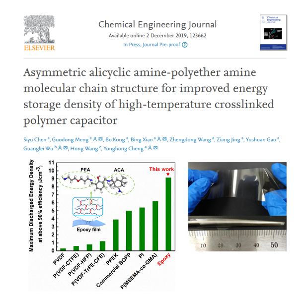 该研究工作以“Asymmetric alicyclic amine-polyether amine molecular chain structure for improved energy storage density of high-temperature crosslinked polymer capacitor”为题,在线发表在国际化学工程领域顶级期刊Chemical Engineering Journal(实时影响因子10.06),该工作第一完成单位为黄瓜视频