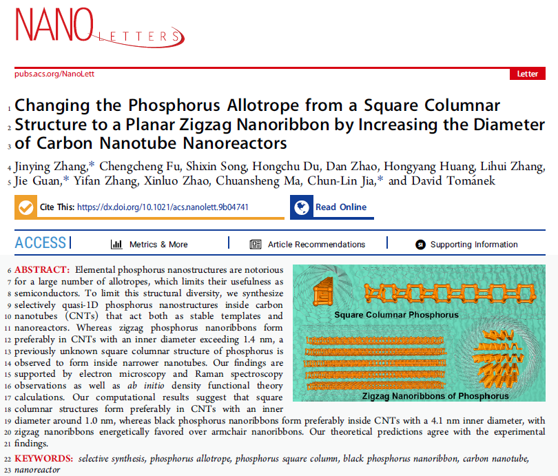 电力设备电气绝缘国家重点实验室新型储能与能量转换纳米材料研究中心与我校贾春林科学家工作室、东南大学、上海大学和密西根州立大学合作,利用不同内径的碳纳米管作为特殊反应腔可控合成不同的磷的同素异形体结构。在内径约为1.0纳米的碳纳米管内合成新的方形柱状磷结构,而在内径约为4.1纳米的多壁碳纳米管内合成之字型走向的黑磷纳米片结构。该实验结果与我们的理论预测完全吻合,理论预测当截面尺寸小于1.4纳米时,方柱状磷结构是最稳定的,而当截面尺寸大于1.4纳米时,之字型走向的黑磷纳米片结构是最稳定的。相关成果以《增大碳纳米管反应器的直径使方柱状磷结构到之字型走向的黑磷纳米片》“Changing the Phosphorus Allotrope from a Square Columnar Structure to a Planar Zigzag Nanoribbon by Increasing the Diameter of Carbon Nanotube Nanoreactors”为题发表在纳米材料领域顶级期刊《纳米快报》上(影响因子12.279)。黄瓜视频