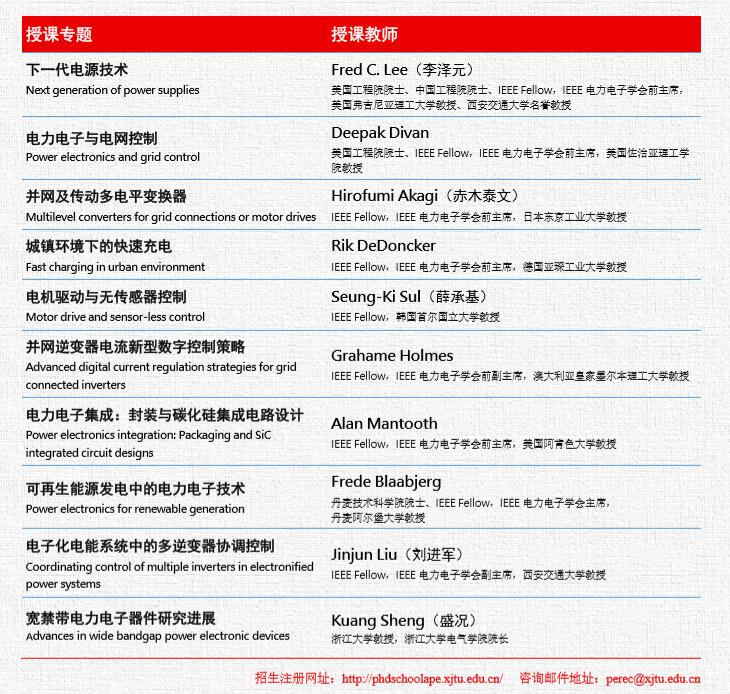 发起并主办,IEEE电力电子学会技术合作主办,亚洲电力电子协调委员会协办。2020年高等电力电子技术亚洲博士学校共邀请到10位授课教师,分10个专题向学员讲授电力电子技术近期发展趋势和最新前沿研究成果。每个专题按半天安排,讲授3个小时。具体授课信息如下: