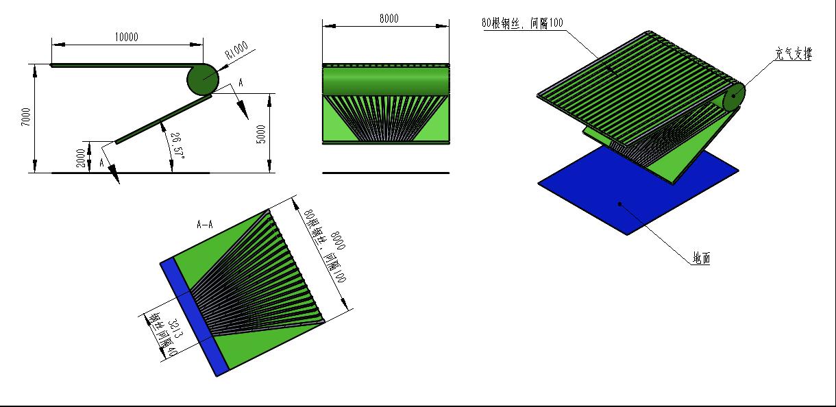 1、 系统结构及尺寸见图。图中蓝色部分为地面,天线为钢丝部分,绿色部分为充气支撑,钢丝固定于充气支撑表面。自行设计支撑结构,中间部分不得有金属部件。