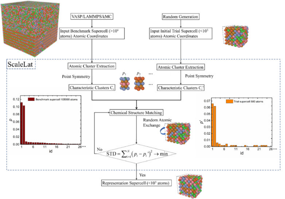 高熵合金体系(High-entropy alloys)和高熵氧化物(High-entropy oxides)由于其原子尺度结构存在长程无序特点,因而在力学、电学、磁学、电化学储能及催化性能方面赋予全新的物理和化学特性,受到国内外学者的广泛关注,成为目前国际上的研究热点。常规采用量子力学方法直接研究原子排列长程无序的非晶态材料、高熵合金或高熵氧化物需要通过构建近似等效超晶胞模型来实现对其结构、物理及化学性质的计算,超胞模型在尺度选择方面目前缺乏统一的标准,且建模等效过程是基于纳米及更小尺度晶胞建模外延物理思想(Bottom-up),其超晶胞模型的合理性及计算性质的收敛性都存在争议。