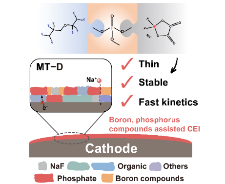钠金属电池由于具有较高的能量密度、丰富的钠资源储备与优异的成本效益,在移动设备和智能电网等众多领域有广阔的应用前景,被认为是实现高比能钠基电池的可行途径。然而,在高电压条件下,正极/电解液界面(CEI)上严重的寄生反应与电解液的持续性分解往往会导致容量的快速衰减,进而导致电池难以稳定地工作。同时,当与具有高反应活性的钠金属搭配时,传统电解液中易燃的有机溶剂使电池在过热、过充电等特殊情况下存在严重的安全隐患。基于上述,开发具有优异阻燃特性,并能形成稳定高效的CEI的电解液,是实现钠金属电池大规模应用的关键技术。