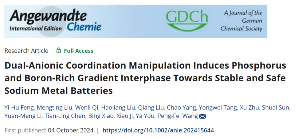 该研究成果以《双阴离子配位构造富磷/硼的正极/电解液界面实现安全稳定钠金属电池》(Dual-Anionic Coordination Manipulation Induces Phosphorus and Boron-Rich Gradient Interphase Towards Stable and Safe Sodium Metal Batteries)为题,发表在国际顶尖学术期刊《德国应用化学》(Angewandte Chemie International Edition)上。黄瓜视频