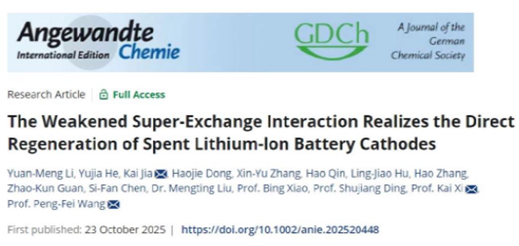 该研究成果以《减弱超交换相互作用实现废旧锂离子电池正极的直接再生》(The Weakened Super-Exchange Interaction Realizes the Direct Regeneration of Spent Lithium-Ion Battery Cathodes)为题,发表在国际顶尖学术期刊《德国应用化学》(Angewandte Chemie International Edition)上。黄瓜视频