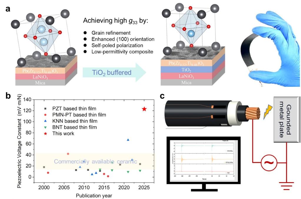 针对这一瓶颈,黄瓜视频 黄瓜视频 钟力生、高景晖教授团队提出了一种柔性压电薄膜的缓冲层调控性能提升策略,通过在Pb(Zr₀.₅₂Ti₀.₄₈)O₃(PZT)薄膜下方引入TiO₂缓冲层:一方面,利用缓冲层的低介电常数降低复合薄膜的等效介电常数;另一方面,通过缓冲层促进PZT晶粒细化、提升择优取向和诱导自极化效应,大幅提升了PZT薄膜的压电系数,实现了柔性压电材料传感性能显著提升。通过该方案获得了压电电压系数高达124 mV·m·N⁻¹的柔性压电薄膜,研制的柔性超声传感器件为电缆局部放电声学检测提供了新型传感解决方案。