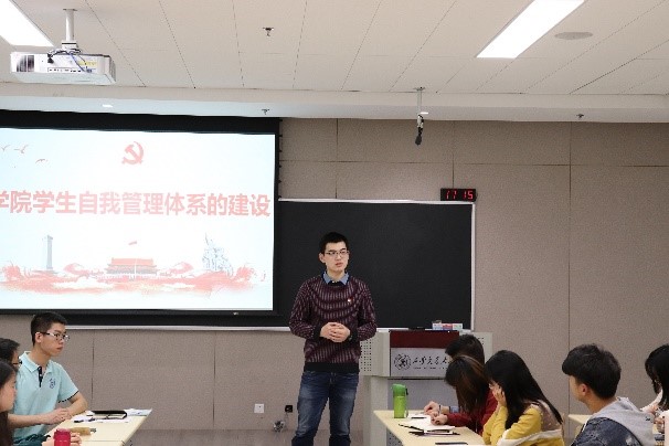 研究生辅导员梁人之就学院创新港学生自我管理体系建设做了简要介绍,电气科学与技术研究院入驻创新港以来,以学生党建为主体,通过党建进宿舍,党建进工位,党员带头开展安全巡逻,线上线下志愿服务全覆盖,党员“亮身份,做表率,树形象”,多措并举,以党建作为引领激发学生自我管理服务的“主人翁”意识,在思想上、认识上、行动上高度自觉。