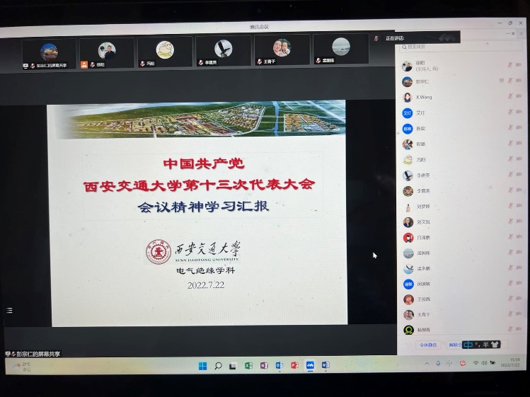 第十三次代表大会精神,按照学院分党委要求,7月22日,彭宗仁教授在绝缘教工党支部开展专题宣讲。宣讲会以线上方式进行,由绝缘教工党支部书记徐阳教授主持,支部全体党员参加。