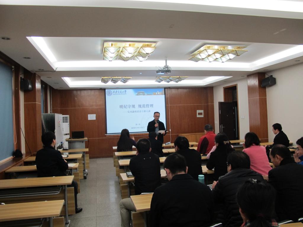 校纪委委员开展党风廉政建设专题宣讲,是学校以“明规守纪 立德树人”为主题的2015年党风廉政建设宣传教育系列活动之一,通过此次活动,加强了学院党员干部思想政治教育,提高认识、凝聚共识,学院将按照学校统一部署落实党风廉政建设工作。