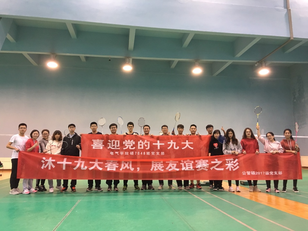 积极筹划、组织多种形式的专题学习研讨活动。为了进一步营造十九大精神学习氛围,深化理论认识,加强不同学院、不同学科之间的交流协作,提升党员的身体素质,10月22日下午,硕7048党支部联合公管学院2017级新生党支部在交大体育馆共同开展了一场羽毛球联谊赛。本次活动本着友谊第一、比赛第二的原则,欢迎支部同学踊跃报名参加,体育馆中同学们激情飞扬的身影尽显交大学子的青春与活力。