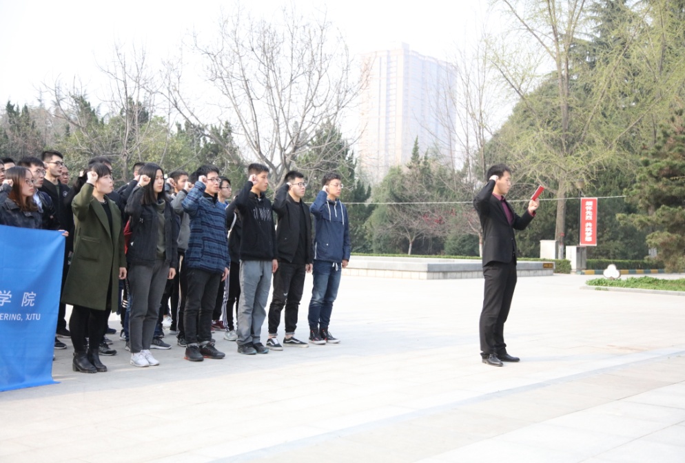 团工委书记罗文成老师特别强调:在这里-西安革命烈士陵园,躺着768位革命烈士,他们为追求救国救民的真理抛头颅,洒热血;为中华民族的解放事业前仆后继,视死如归。临近清明,我们组织这样一场爱国主义教育活动,就是要以他们为榜样,学习他们百折不挠、英勇不屈的战斗精神,学习他们无怨无悔、大公无私的奉献精神。我们会永远铭记他们的丰功伟绩;就是要通过扫墓、献花、宣誓、默哀等活动形式增强大家的仪式感,通过种种仪式让大家增强爱国情怀,并不断外化于行、内化于心。