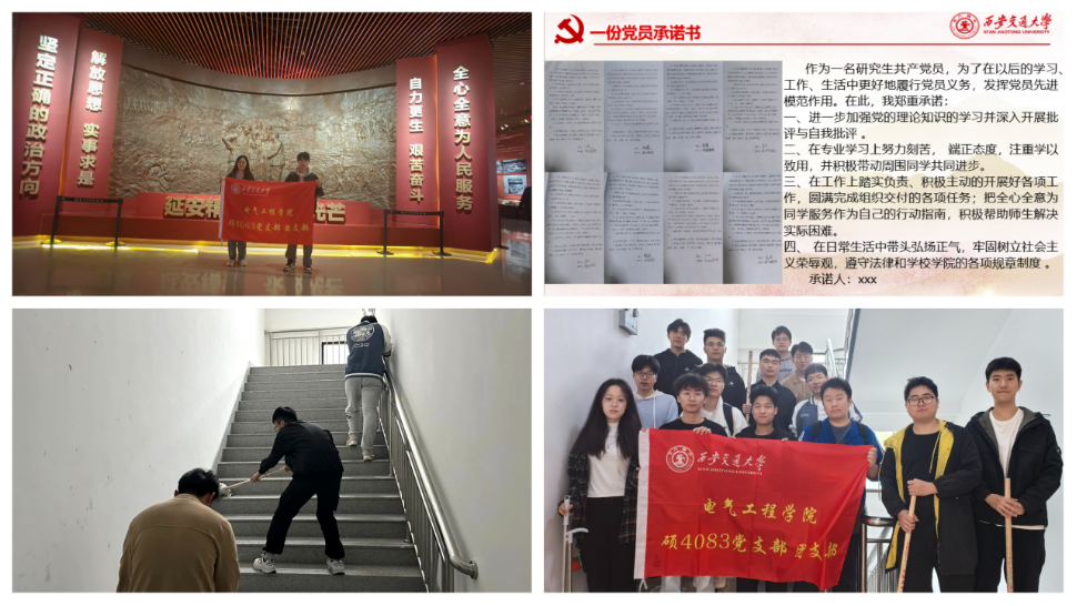 思想是行动的先导,理论是实践的指南。为将理论转化为实际行动,充分发挥党员的先锋模范作用,各党支部积极鼓励党员投身志愿服务活动,在服务人民、助人为乐中践行党的宗旨。硕4083班党支部全体成员积极投身于志愿服务,从校园卫生清洁到楼层隐患巡查,以实际行动诠释了何无私奉献,生动践行了党员的初心和使命;硕4063党支部成员追寻红色记忆,传承革命精神,赴延安开展实践调研,通过参观延安红色教育基地、聆听先辈事迹,通过实地参观红色教育基地、聆听革命先辈的英雄事迹,深刻感悟延安精神的精髓要义。