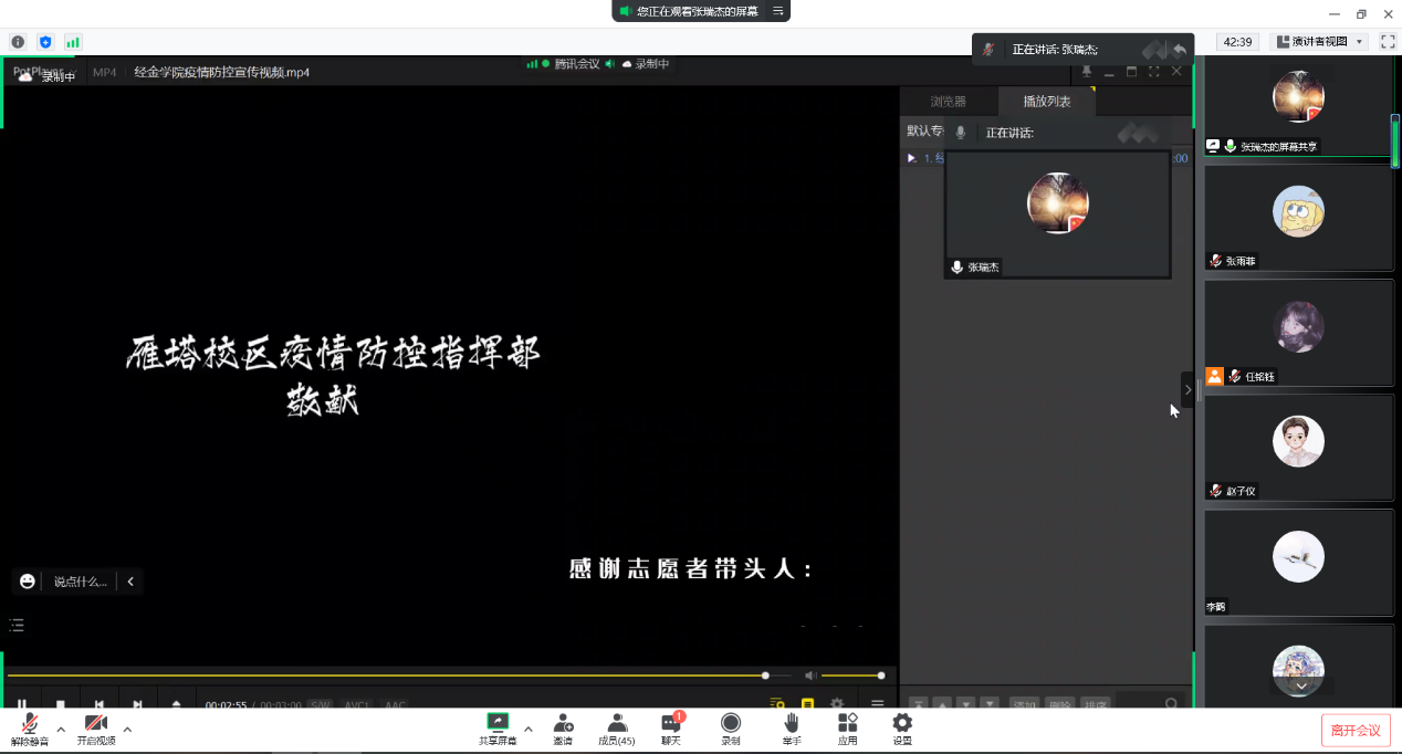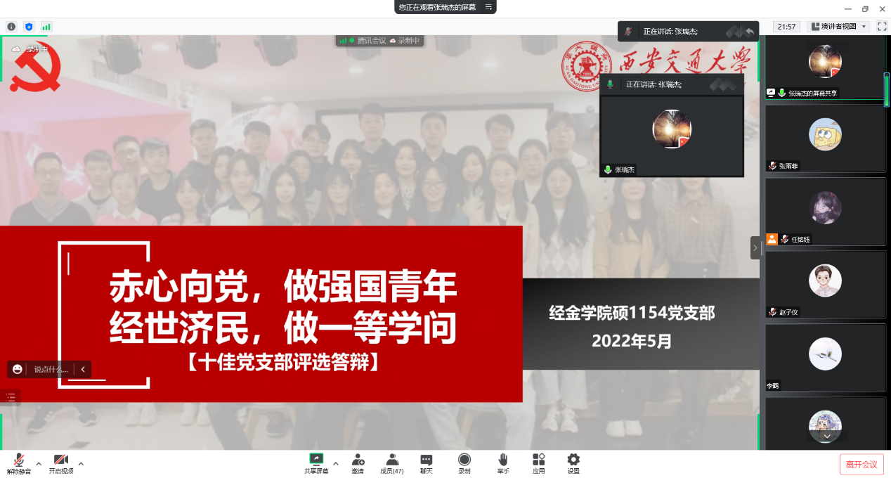 经金学院研究生会主席、硕1154党支部书记张瑞杰做主题分享,通过回顾他的学生工作经历,从个人层面展现榜样青年的风采。他以“一个主题、两个路线、三个目标、四个阵地、五个小组”为主线,分享所在集体的党团班高效协作的经验教训,从基层党组织建设角度展现先进集体的事迹。最后张瑞杰以视频的方式分享疫情封控期间的工作,从招募志愿者、组建志愿先锋队、到物资的协调与搬运,充分展示出一位优秀党员忠于职守、不畏难关的心路历程。他表示,站在新时代、新起点,希望各位学子要时刻铭记来时的路,不忘初心、坚定信念,成为有担当、有理想、有情怀的新时代青年。