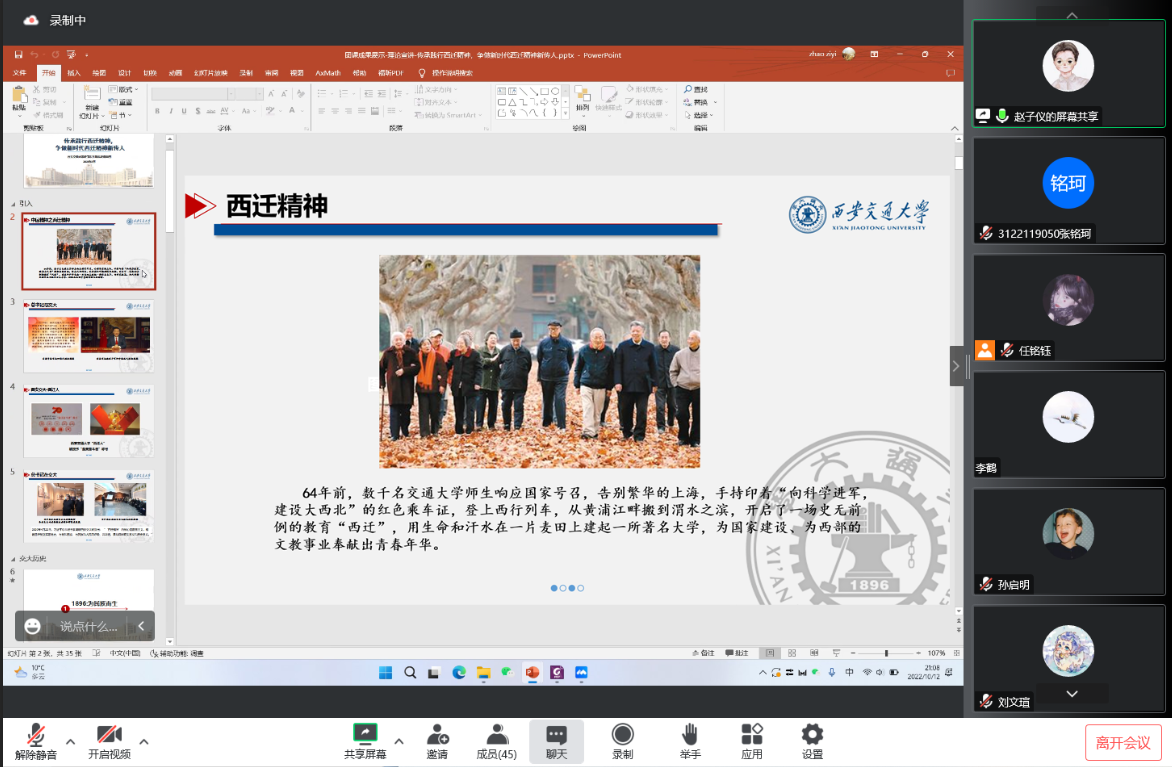 硕2175团支部书记任铭钰表示:青春逢盛世,奋斗正当时!作为交大青年,要自觉听党指挥跟党走,传承发扬好西迁精神,以良好的精神风貌和优异的工作成绩迎接党的二十大的胜利召开!