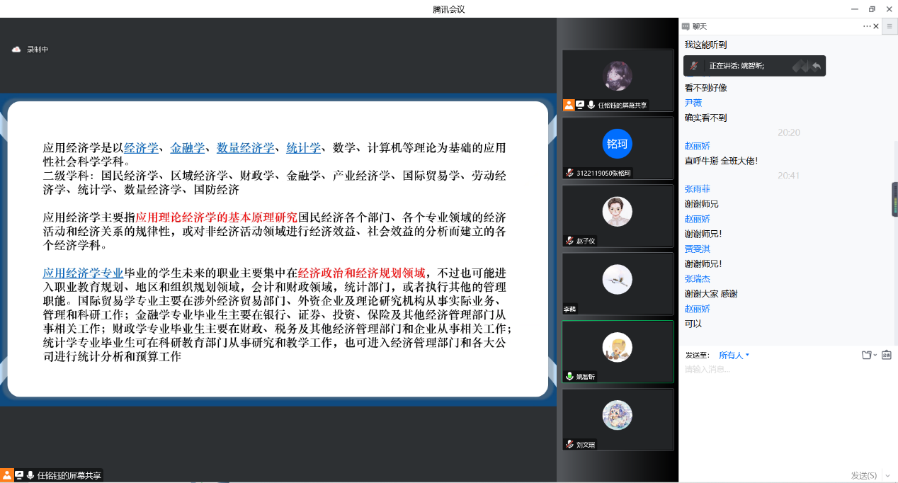经济与金融学院姚智昕同学从应用经济学的含义出发,介绍其主要研究内容,并从国际贸易学、金融学、财政学、统计学等不同方向,有针对性地对不同专业的未来职业选择进行详细讲解,引发支部成员对专业课程学习的深度思考。
