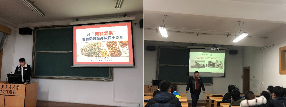 ,面向硕8040、8041、8046、8047党支部的同学们,举办了一场别开生面的改革开放主题宣讲会。宣讲团成员陈枫、刘天洋分别以“从‘两颗坚果’看我国改革开放四十周年”和“为什么要改革开放”为主题,从不同角度对改革开放的历史进行回顾。