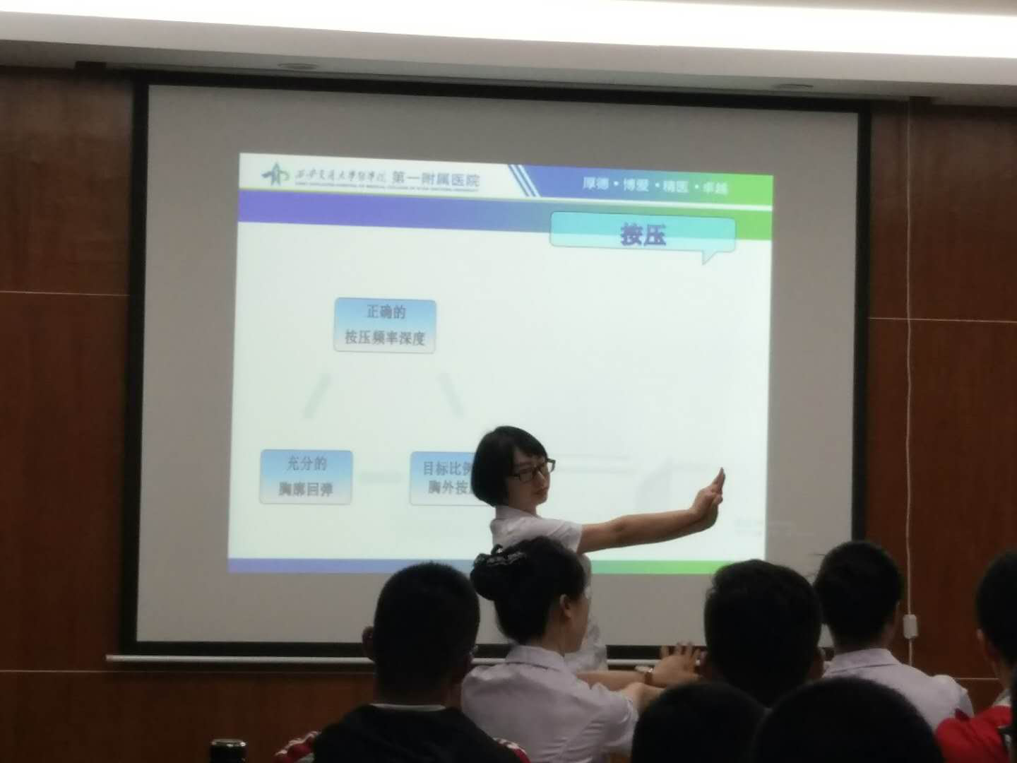然后,柳丽护士着重讲解了徒手心肺复苏的方法。她指出,在国内,徒手心肺复苏的普及率并不高,普通群众在遇到突发情况时往往束手无措。她希望大家能够掌握心肺复苏的方法,在关键时刻能起作用。柳护士亲身示范,讲解这套操作流程,并且分享了操作口诀,这充分调动了在场同学的积极性,大家纷纷学习,兴致高涨。