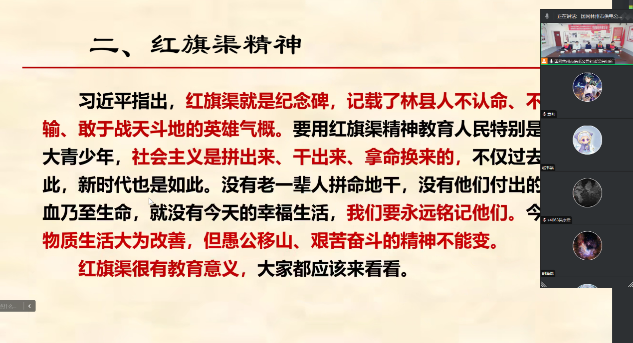 随后,国网安阳供电公司党建部主任杜丽平同志详细介绍了《电网企业概况及太行红旗渠共产党员服务队相关情况》。杜主任的讲解不仅让大家对电网企业有了更全面的了解,更对太行红旗渠共产党员服务队的先进事迹深感敬佩。