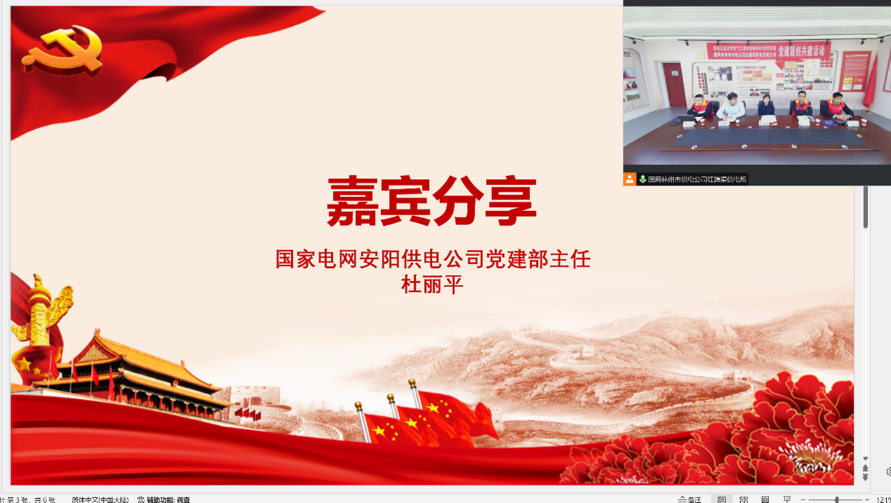 硕4063党团支部与国网林州市供电公司红旗渠供电所党支部党建联创共建活动。此次活动通过线上会议的方式,实现了两地党员的跨地域交流与合作,进一步促进了党建工作的创新与发展。国网安阳供电公司党建部杜丽平主任、国网林州市供电公司红旗渠供电所党支部的同志们出席本次活动。