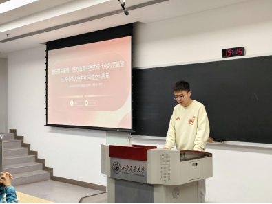 会议的第二阶段,硕5080党支部弓喆同志继续就同一专题进行汇报。他以时间为脉络,从“历史进程、伟大成就、破壁之路”三个维度带领大家回顾了新中国七十六载的光辉历程,重温了中国共产党团结带领全国各族人民实现从站起来、富起来到强起来的伟大飞跃。他重点介绍了我国电力工业的发展历程——从新中国成立初期的“一穷二白”,到如今构建起世界领先的能源体系。他鼓舞支部同志在科研与学习中赓续奋斗精神,为实现中国式现代化贡献青春力量。