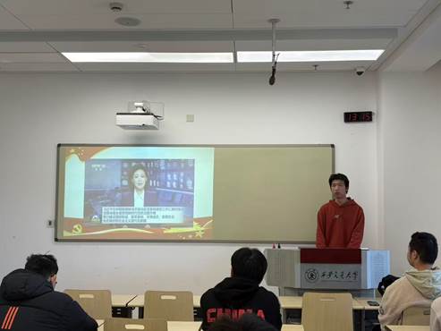 会议伊始,张珈铭带领全体同学认真学习了习近平总书记在庆祝中华人民共和国成立76周年招待会上所作重要讲话。他从艰苦卓绝的辛亥革命和抗日战争切入,回顾新中国成立时的百废待兴,到完成社会主义革命、脱贫攻坚全面胜利等阶段性成果,再到习近平总书记高瞻远瞩,放眼国际,提出构建人类命运共同体,生动地展现了我国发展的壮丽史诗。他强调,回望历史是为了在新时代的坐标中校准青春的方向,激励全体同学厚植家国情怀,到祖国和人民最需要的地方发光发热,为中国式现代化建设贡献青春力量。