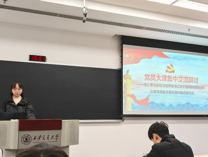 与会党员和团员同学结合自身专业学习与科研实践,踊跃发言,分享学习体会。硕5074班党支书杨莘苑同学谈到,《习近平:加快建设教育强国》文章系统阐述了新时代教育强国建设的战略方向、重点任务和实施路径,为高等教育改革发展指明了前进方向。作为新时代的研究生,身处国家发展的重要时期,深感责任重大、使命光荣。
