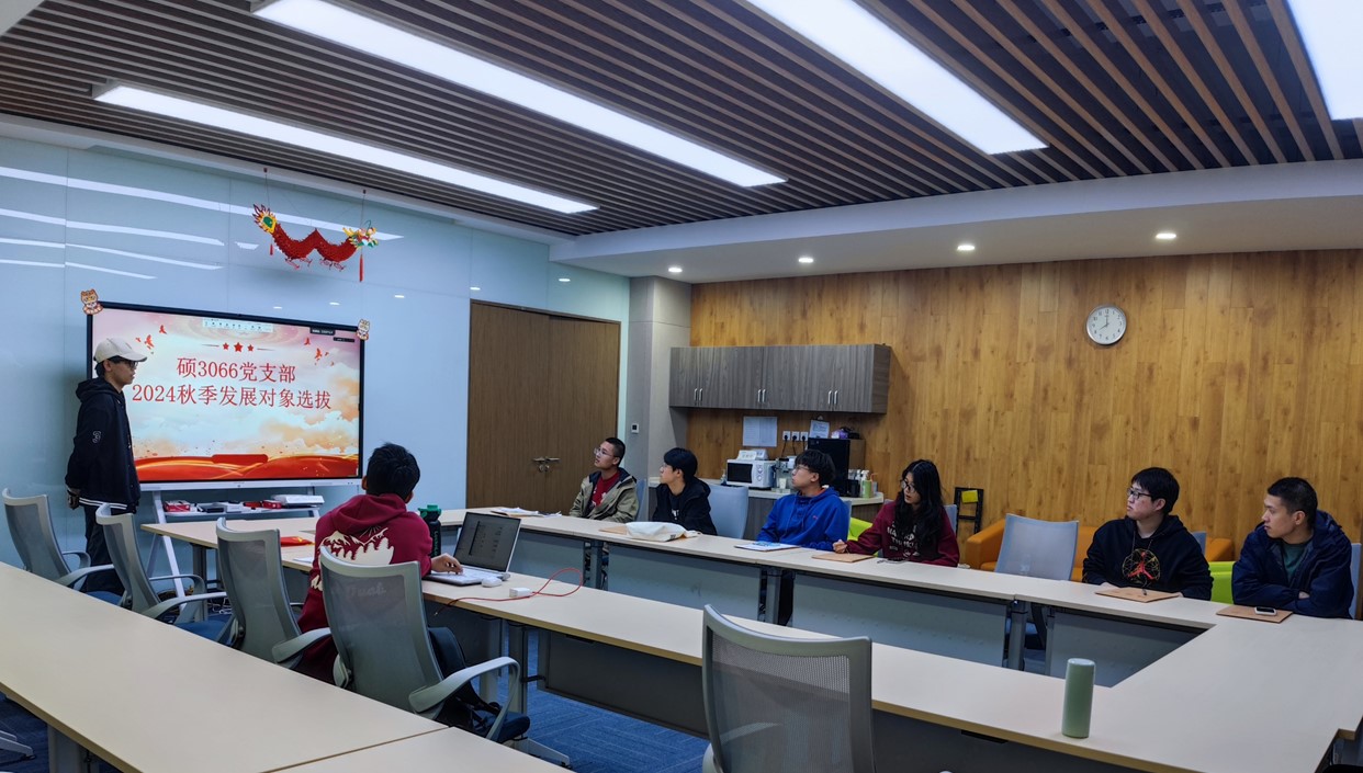 为深入落实新时代党的建设总要求,严格把控党员发展“质量关”,提高党员发展质量,硕3066党支部于11月1日晚在3-3155会议室召开了2024秋季发展对象选拔大会。硕3066党支部全体成员参加大会,会议由支部书记孟雨晨同志主持。