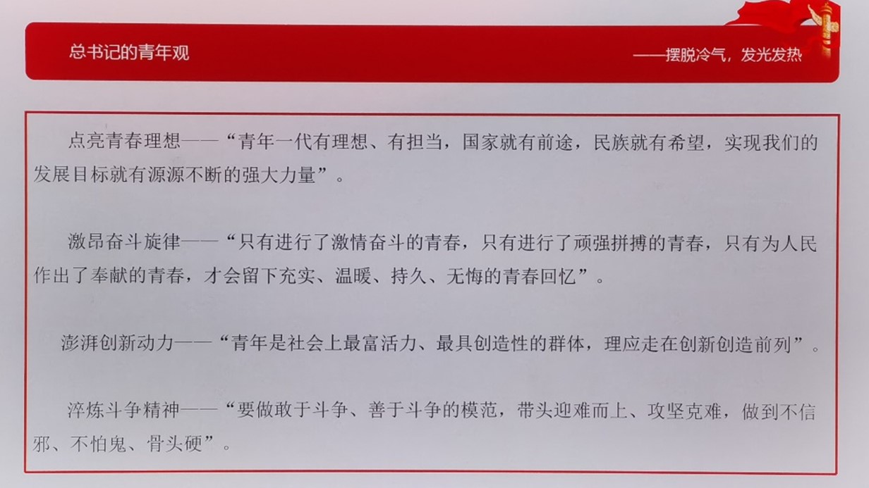 硕4075班嵇一凡同学和支部成员一起学习了总书记的青年观。总书记的青年观强调“行循自然”是尊重客观规律的重要体现,结合马克思主义理论,鼓励青年在实践中深入理解自然规律,发挥主观能动性。青年观中提到青年应在实践中探求真理、勇于创新、明确志向,并在面对困难时培养从容不迫的生活态度。新时代青年要以实现中华民族伟大复兴为己任,珍惜时代机遇,积极参与国家建设。总书记指出,共青团要成为党的助手和后备军,承担起培养青年、引导青年成长的重要责任。