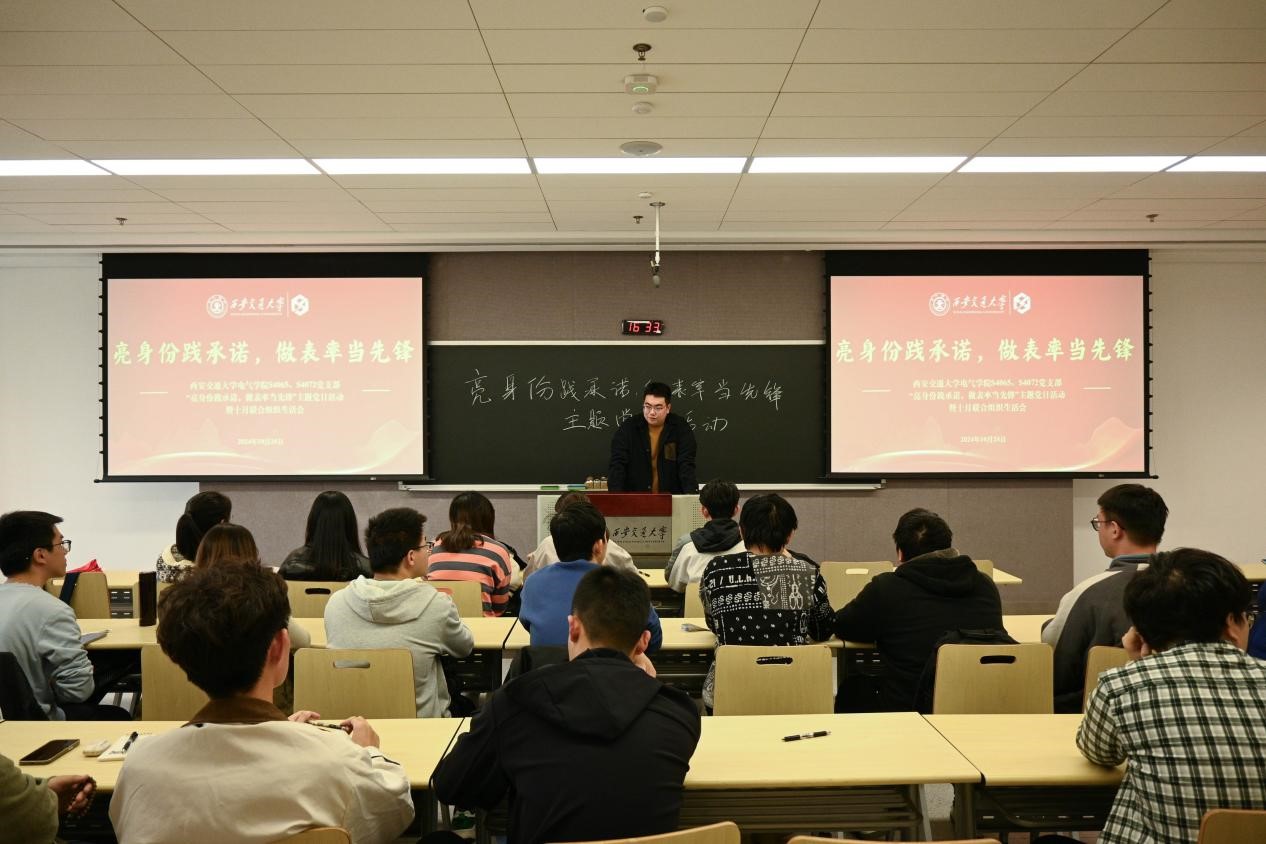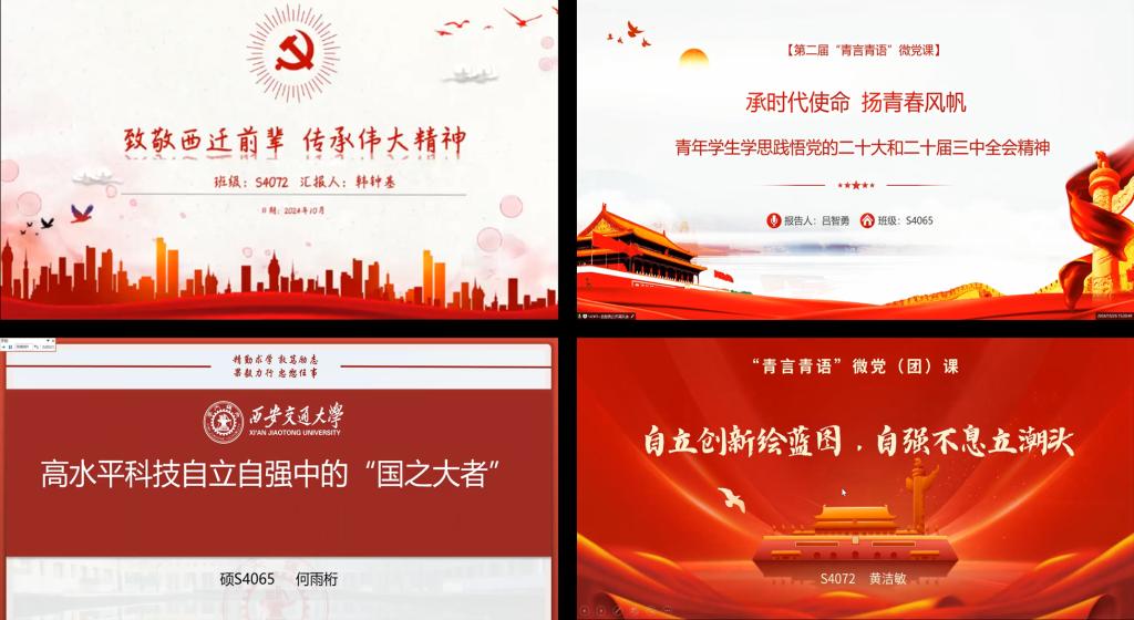 第二届“青言青语”微党课比赛预赛。本次比赛共吸引了两支部12名同志参与其中,围绕中国式现代化推进中华民族伟大复兴这一主题,结合自身学习、科研经历,分享了对习近平新时代中国特色社会主义思想的理解与感悟,探讨了青年学生如何践行党的二十大精神,讲述了高水平科技自立自强背后的故事,以及西迁精神对当代青年的意义。活动激发了同学们的爱国情怀和社会责任感,加深对党的光辉历程和伟大成就的了解,提升其党性修养和个人表达等综合能力。