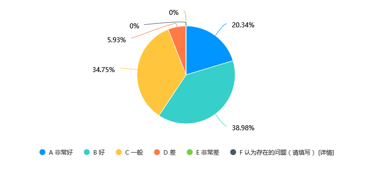 根据数据分析,城市医疗服务质量的反馈总体上偏向积极。选择“好”的比例最高,达到四成,而“非常好”的比例约二成。“差”和“非常差”的反馈比例很小。显示出大部分人对服务质量的认可。未来可以加强对医疗服务质量的宣传和教育,提升医疗服务的标准化和可及性,以进一步提高公众的满意度。