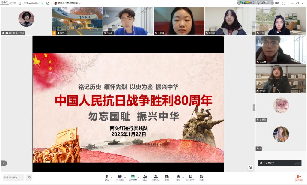 在中国人民抗日战争胜利80周年之际,为深入挖掘和传承抗日战争的伟大精神,增强青年学生的历史意识和社会责任感,西交红迹行实践队于1月17日至2月14日开展了以“烽火岁月印,抗战精神承”为主题的社会实践调研活动。此次实践活动涵盖团课学习、实地走访和采访调研,通过一系列丰富多彩的活动,队员们不仅系统学习了抗日战争的历史,更深刻领悟了抗战精神的内涵与价值。