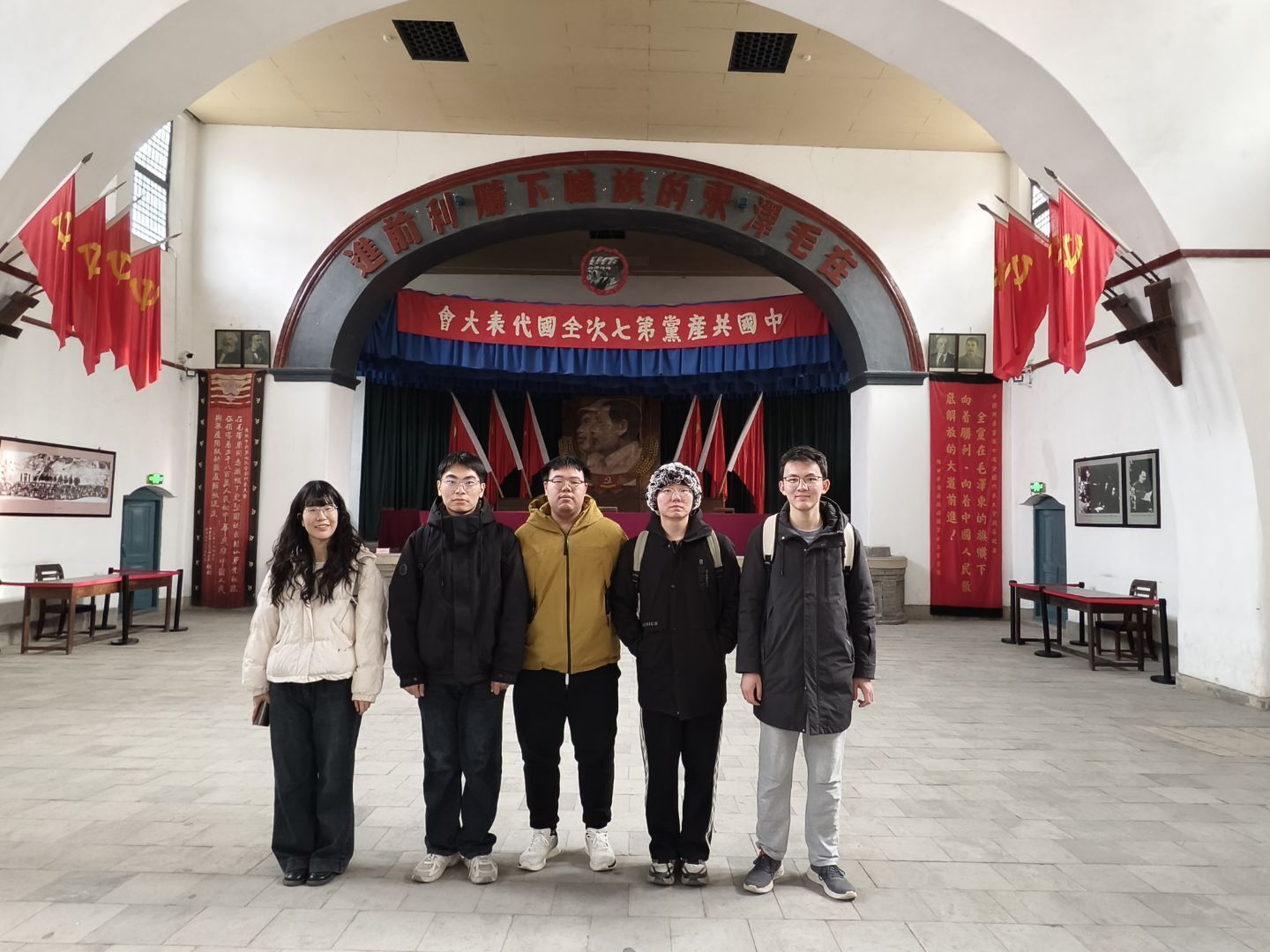 随后,同学们来到了杨家岭革命旧址,开启了一场意义非凡的参观学习之旅。杨家岭是中国革命历史上的重要地标,尤其是中共七大的召开,使其在党史中占据着举足轻重的地位。中共七大被誉为“团结的大会、胜利的大会”,它不仅为新民主主义革命的胜利指明了方向,更成为党史上一座熠熠生辉的里程碑。