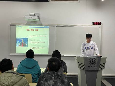 丁祥熙同学带领全体团员系统梳理特朗普执政时期中美关系演变,通过案例分析揭示贸易摩擦、科技封锁对中国产业升级的挑战。团员们深刻认识到,面对国际竞争压力,青年学子需以战略定力应对不确定性,既要保持开放合作胸怀,更要在关键领域提升自主创新能力。