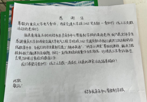 教育是实现民族振兴和国家繁荣的重要基石。然而,在中国的偏远地区,有很多孩子由于教育资源的匮乏,无法获得良好的教育。为了弥补这一教育资源的不均衡,硕3065班联合重庆大学电气青协开展了一次具有深远意义的云支教活动,为玉树藏族自治州称多县珍秦寄宿小学中心的学生提供了科技支教和英语支教,为他们的未来添上了有爱的色彩。